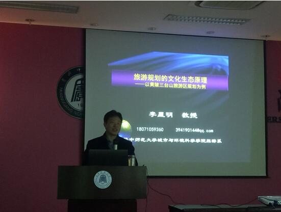 李星明教授以旅游发展的热情为这次讲座的引论展开论述,介绍了关于文化的相关概念,坚定了文化是旅游业的灵魂以及最大的旅游资源,对旅游资源的开发可以从多层次结构的文化入手,阐述了文化生态系统的构成,旅游规划的系统内容。基于资源与文脉的耦合性,旅游区应该有自己的主题,李星明教授提出了自己的看法,以黄陂三台山的文化生态原理开发为例,提出慢下来,静下来,放下来三大点,以宗教信仰为主题开发当地的旅游资源,这一改造吸引了众多游客,充分体现了旅游规划的文化生态原理的重要性。